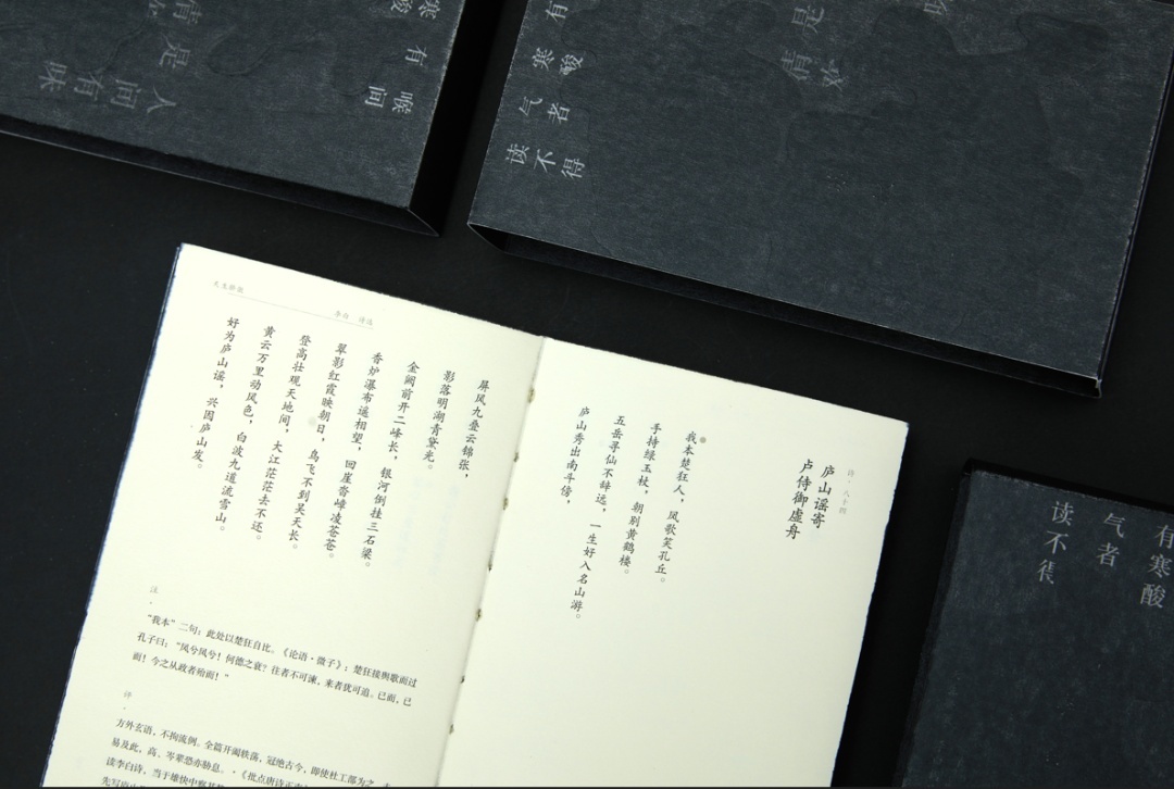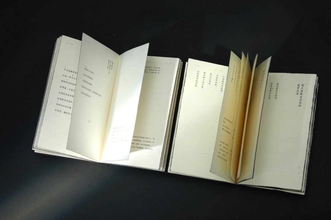 两本书封底互相聚合,既可180度平摊,左词右诗同期阅读,也可合起来,正背纵情一面缓慢翻阅。