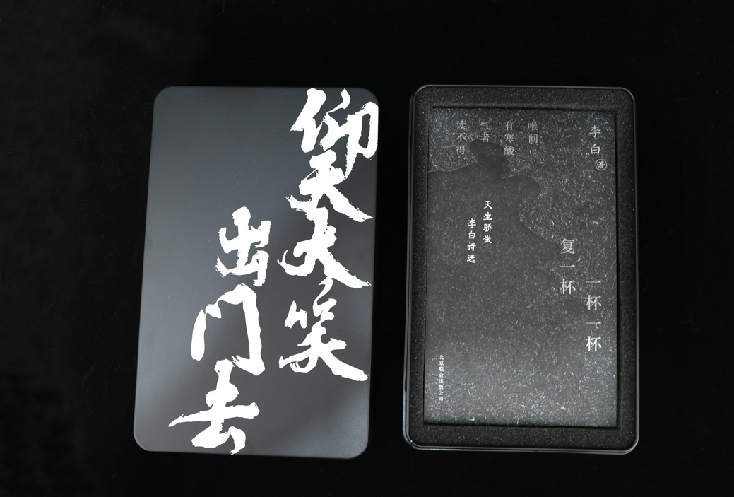 包装上也极具绸缪感。袭取了墨黑金属书盒。玄色磨砂铁盒上印有银白色带细砂质感的书道——“仰天大笑外出去”,彰显专有个性。