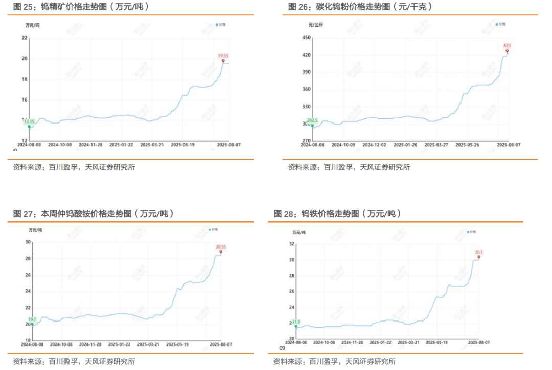 综述:本周(2025.8.1-2025.8.7)钨价上调。截止到8月7日,65度黑钨精矿均价在19.55万元/吨,较上周持平;仲钨酸铵在28.55万元/吨,较上周上调0.15万元/吨,70钨铁均价在29.1万元/吨,较上周上调0.2万元/吨,碳化钨粉在423元/千克,较上周上调5元/千克。钨原料端挺价神思犹存,卑劣市集受原料撑持保持坚挺,但现货成交量结合有限,现货流畅速率沉稳,短期关怀赢利盘及卑劣开工默契。钨粉末受成本鼓动报价向440元/公斤试探,但受高温天气、合金需求低迷等身分冲击,消费放量有限,市集较高位报盘尚未获取招供,不雅望标的性音信清亮。
