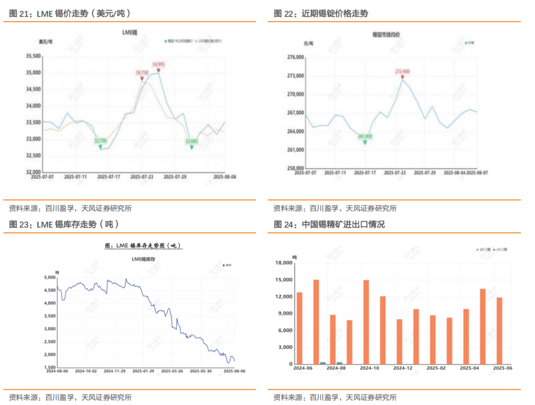 综述:本周(2025.8.1-2025.8.7)锡价止跌反弹。搁置8月6日收盘,伦锡收盘33230好意思元/吨,较上周同期比拟着落180好意思元/吨,跌幅0.53%。周初非农数据的“弱信号”,重迭特朗普新关税政策激勉的避险神思同步压制锡价下行。近期好意思国经济数据的疲软默契,使得投资者对好意思联储在9月会议上启动降息的预期赶快升温,市集作念多神思亦再次飞腾,锡价止跌回涨。
