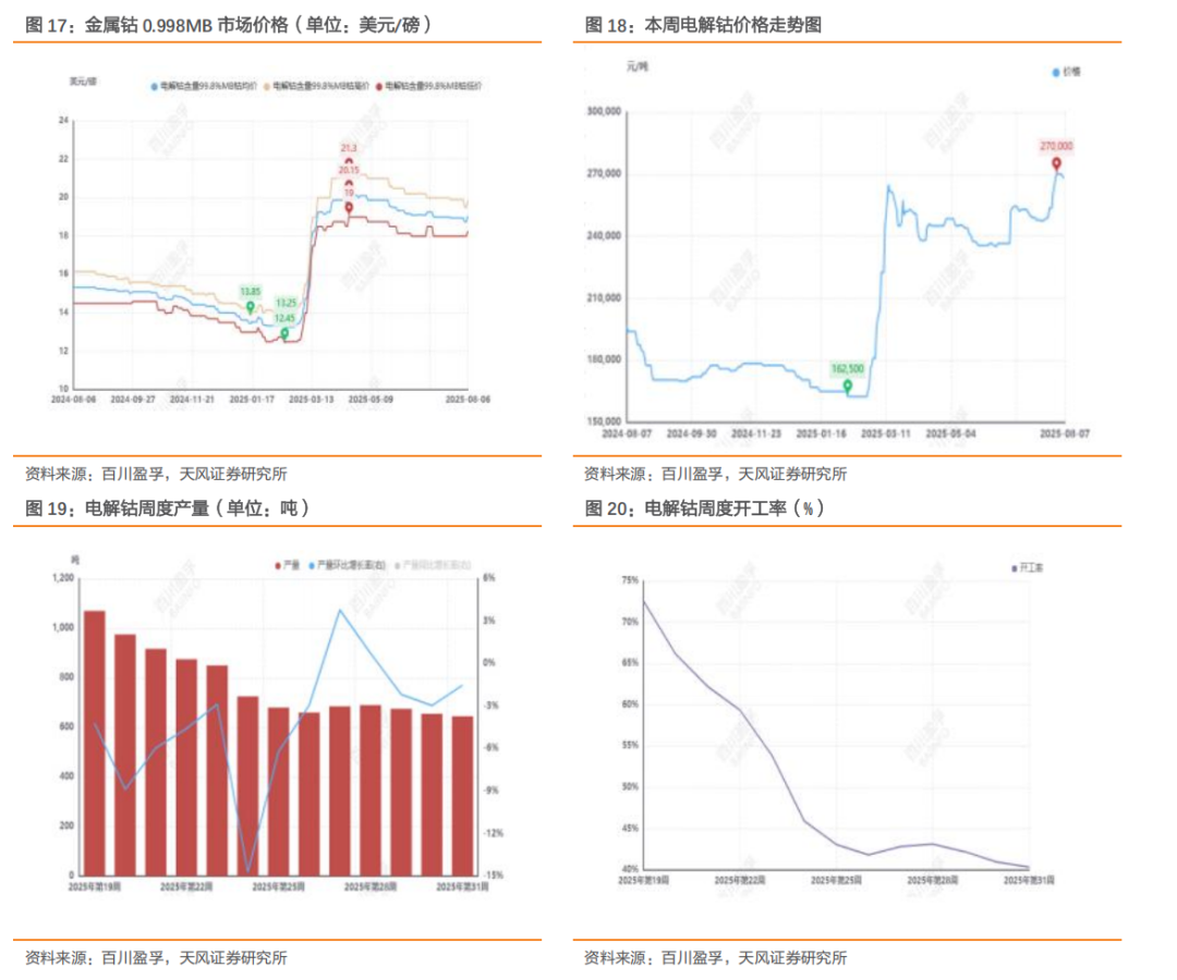 电解钴综述:本周(2025.8.1-2025.8.7)国内金属钴行情轰动整理,搁置8月7日,百川盈孚统计99.8%电解钴价钱26.1-27.5万元/吨,较上周同期均价下调0.2万元/吨,跌幅0.74%。本周国内电子盘钴价轰动运行,电解钴市集价钱随之诊治。周内电解钴行业举座产能愚弄率不足五成,大批冶真金不怕火企业延续封盘不报价策略。由于前期廉价备货透支需求,现阶段市集询价冷清,交投活跃度接续低迷,卑劣仅保管刚需采购。
