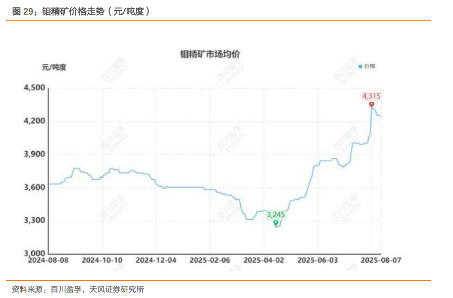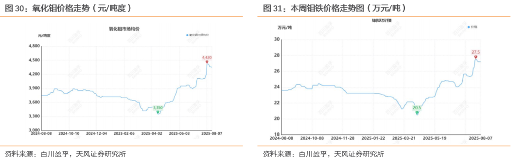 综述:本周(2025.08.01-2025.08.07)行情僵持博弈,钼价回诊治理。搁置8月7日,中国45-50度钼精矿8月7日均价为4245元/吨度,较上周均价下调1.62%:氧化钼8月7日均价为4350元/吨度,较上周均价下调1.58%:钼铁8月7日均价为27.2万元/基吨,较上周均价下调1.09%:一级四钼酸铵8月7日均价为25.7万元/吨,较上周均价下调2.84%;一级钼粉8月7日均价为48万元/吨,较上周均价下调2.04%。本周钼市行情僵持博弈拉锯。在钼价大涨及钢厂相聚声后光,市集行情逐步趋于坦然,场内畏高避险心绪赫然,采购商多严慎操作刚需补库,钢厂进场节拍亦有放缓,虽有钢厂进场招标,但招标量小代表性不高,加之有流标和废标情况,市集举座货源泉畅滞缓。受其影响,原料端价钱窄幅回落但矿山暂不出货且有停产情况,交易商虽积极出货,但廉价货源有限,重迭后续补库繁重,部分持货商多捂货惜售,现货资源仍垂死,价钱波动空间收窄。现时高卑劣市集束缚拉扯制约,僵持式样短期内较难更正,场内严慎不雅望神思占据主导,行情接续消化整理。