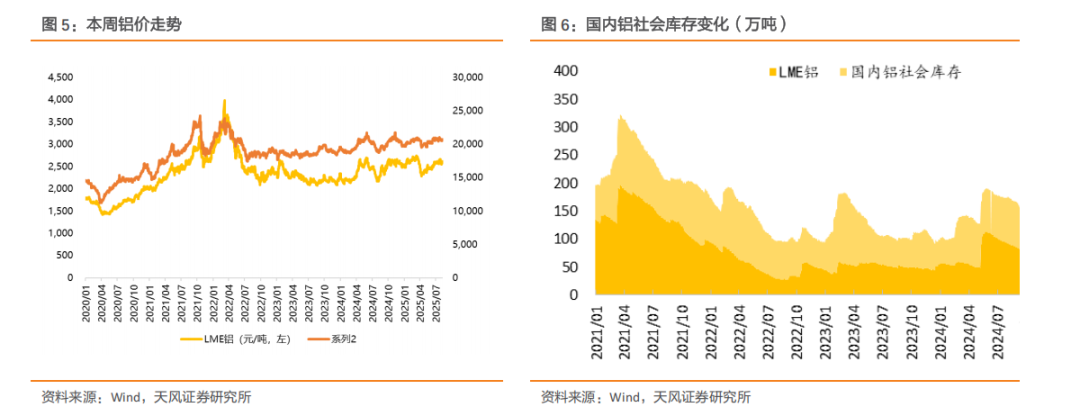市集综述:本周(2025.8.1-2025.8.7)铝价着落。本周外盘铝均价为2578好意思元/吨,较上周比拟着落46好意思元/吨,跌幅1.75%。沪铝主力均价20599元/吨,较上周比拟着落24元/吨,跌幅0.12%。华东现货均价为20568元/吨,与上周比拟着落96元/吨,跌幅0.46%。华南现货均价为20572元/吨,与上周比拟着落84元/吨,跌幅0.41%。政策以及数据链接向好,利好现货铝价,但中国未锻轧铝及铝材出口数目同比减少,铝锭社会库存链接增多,详细来看,现货铝均价小幅着落。