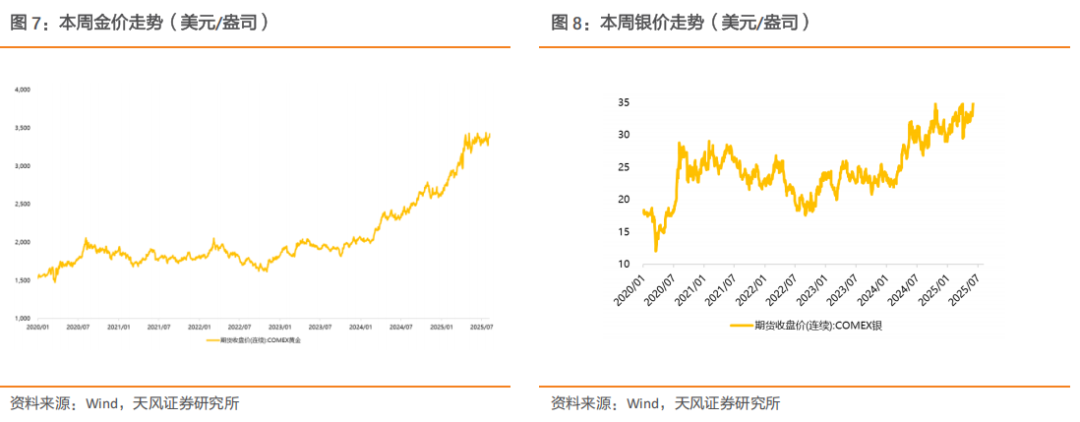 综述:本周(8.1-8.7)金银价钱涨跌互现。搁置8月7日,国内99.95%黄金市集均价777.05元/克,较上周均价飞腾1.23%,上海现货1#白银市集均价9037元/千克,较上周均价着落1.32%。周内好意思国非农处事数据只怕疲软,同期特朗普政府最新关税政策激勉的避险需求刺激。公共经济的不深信性、好意思元的疲软以及好意思联储降息预期的升温,共同为金银价钱的飞腾提供了动能。现时市集恭候好意思国CPI经济数据落地,COMEX金银主力永别运行在3400-3450和38.0-38.5好意思元/盎司之间,沪银在9200-9300元/千克区间内窄幅轰动,沪金主力在783元/克近邻徜徉。