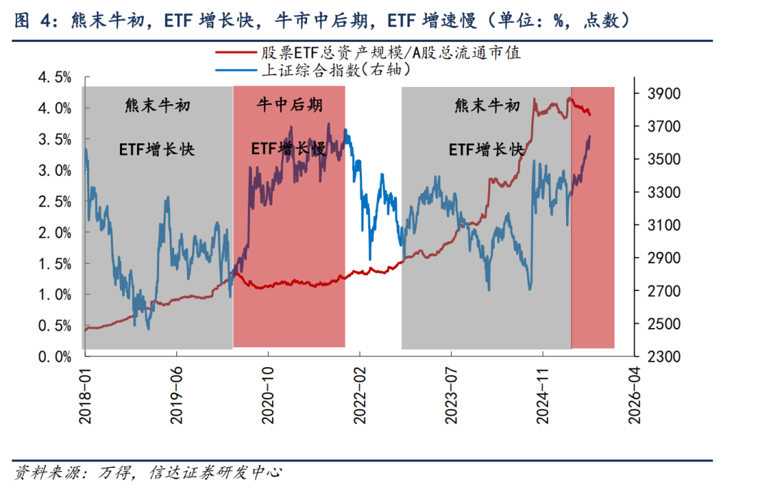 (3)逆势维稳的力量更多,是否会影响牛市高度?2014-2015年牛市是较为纯正的流动性牛市,由于牛市本事涨幅过大,随后的2015年下半年,股市出现了较大的回撤和波动。大部分投资者觉得,鉴于投资者和监管层都经历过2014-2015年的牛市,学习效应可能会死一火牛市的高度。咱们赞同这一判断,然而需要防范的是,当今股市的涨幅比较2014-2015年牛市还小许多,目下这一牵挂可能还尚早。而如若推敲到ETF资金逆势波动对阛阓的影响,这一流程可能也会比较慢,比如2019-2021年牛市,从2020年Q2启动ETF份额彰着下跌,但中枢钞票的高点直到2021年Q1才出现,有些行业(周期、成长等)高点出当今2021年Q4。是以即使后续出现握续的ETF份额萎缩,可能牛市高点也要滞后很万古分才可能出现。