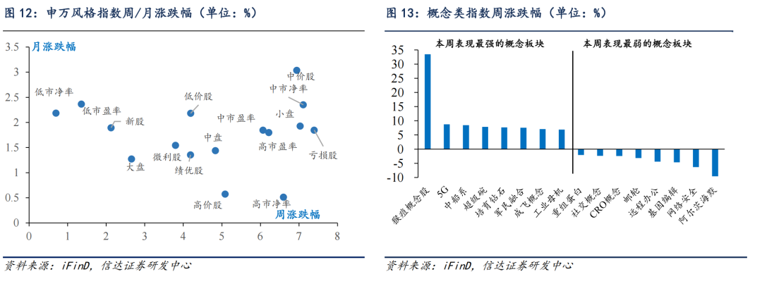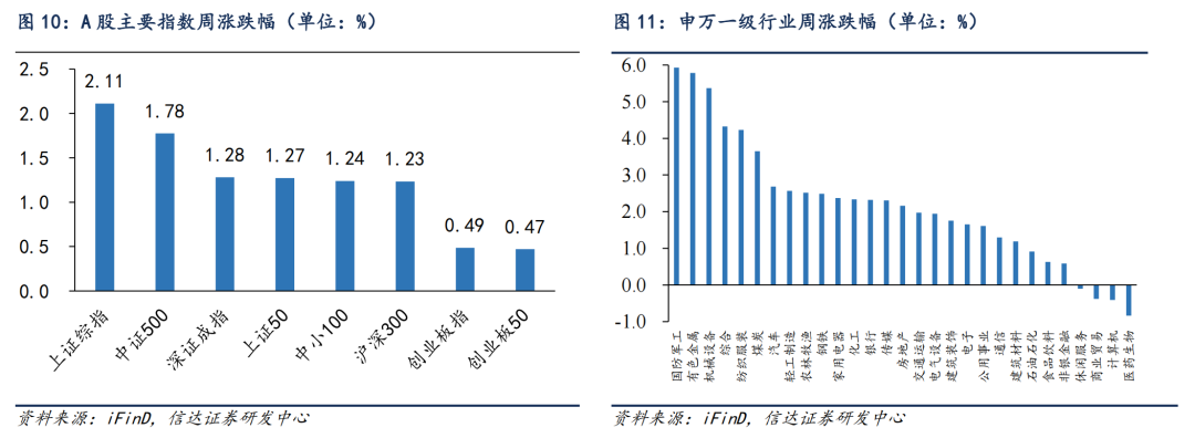 本周A股主要指数大多飞腾,其中上证综指(2.11%)、中证500(1.78%)、深证成指(1.28%)涨幅靠前,创业板50(0.47%)、创业板指(0.49%)、沪深300(1.23%)涨幅靠后。申万一级行业中,国防军工(5.93%)、有色金属(5.78%)、机械建设(5.37%)领涨,医药生物(-0.84%)、臆测机(-0.41%)、买卖贸易(-0.38%)跌幅居前。观念股中,猴痘观念股(33.46%)、5G(8.73%)、中船系(8.48%)领涨,阿尔茨海默(-9.59%)、网罗安全(-6.33%)、基因剪辑(-4.66%)领跌。