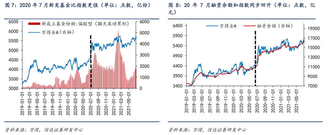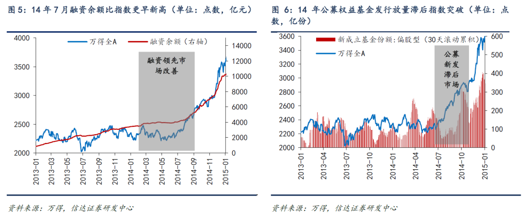比如2014年下半年的牛市主升浪,指数冲突(2014年7月)之前冲突之前融资余额握续增长,比指数更早立异高,并在指数冲突后加快流入。但公募偏股型基金份额增长彰着滞后阛阓,直到2014年10月才开到较强的回升。