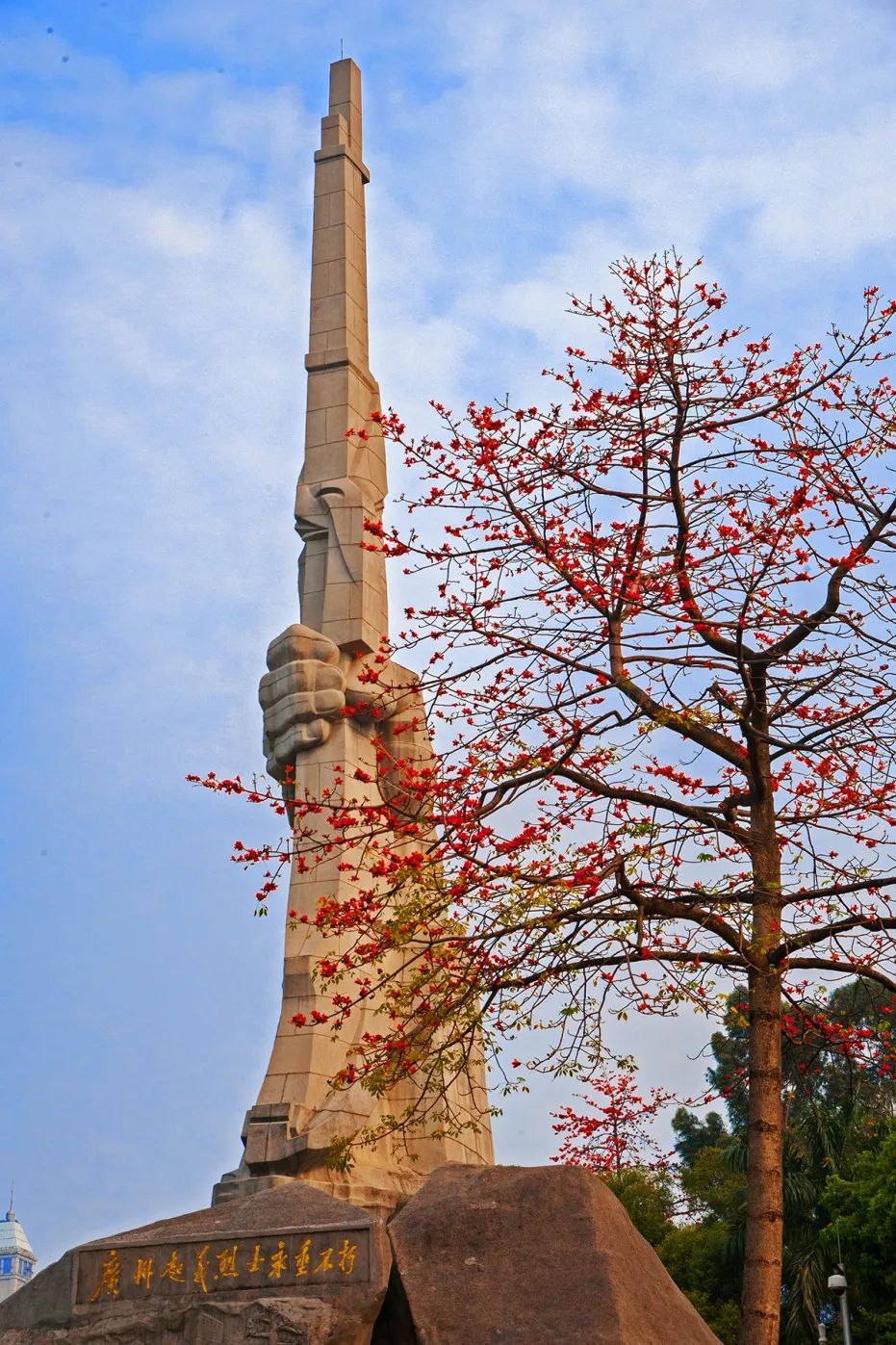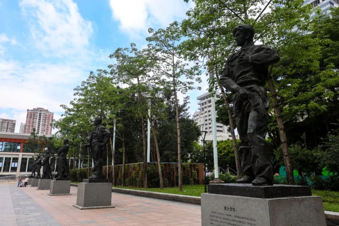 这里屹立着张太雷、叶挺、苏兆征、汹涌、恽代英、叶剑英、杨殷、周文雍、聂荣臻、陈郁、赵自选等11座大型骁雄雕像,每座雕像高度为3.6米,灰色花岗岩基座高1.2米;雕像再加上一个碑祭,分红两排对称枚举在广场上。