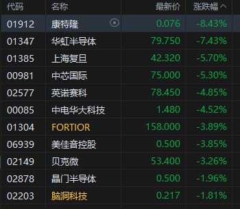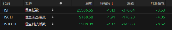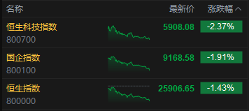 本日,港股三大指数低开低走。收尾收盘,恒生指数跌1.43%,报25906.85点,恒生科技指数跌2.37%,国企指数跌1.91%。盘面上,科网股普跌,阿里巴巴跌超4%,快手、腾讯跌超3%,小米、百度、京东跌超2%,联念念、哔哩哔哩、网易跌超1%;改变药办法逆市高潮,三生制药涨超11%;高铁基建股跌幅居前,中国中车跌超10%;半导体板块走弱,华虹半导体跌超7%。